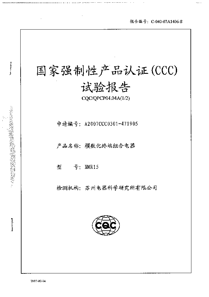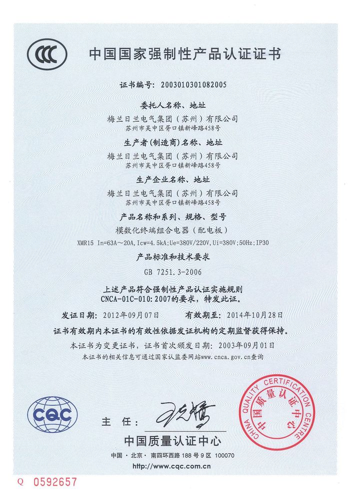 (成套)XMR15 模數化終端組合電器資質證書