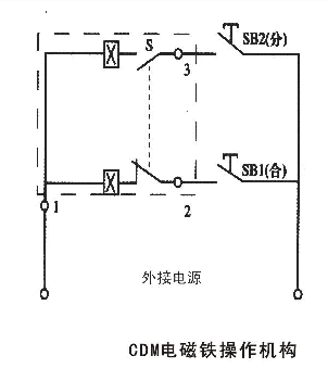CDM電磁鐵操作機構(配用MRMl-63,100,225)接線圖見下圖(虛框內(nèi)為斷路器外符號說明:SBi、SB2操作按鈕(用戶自備)